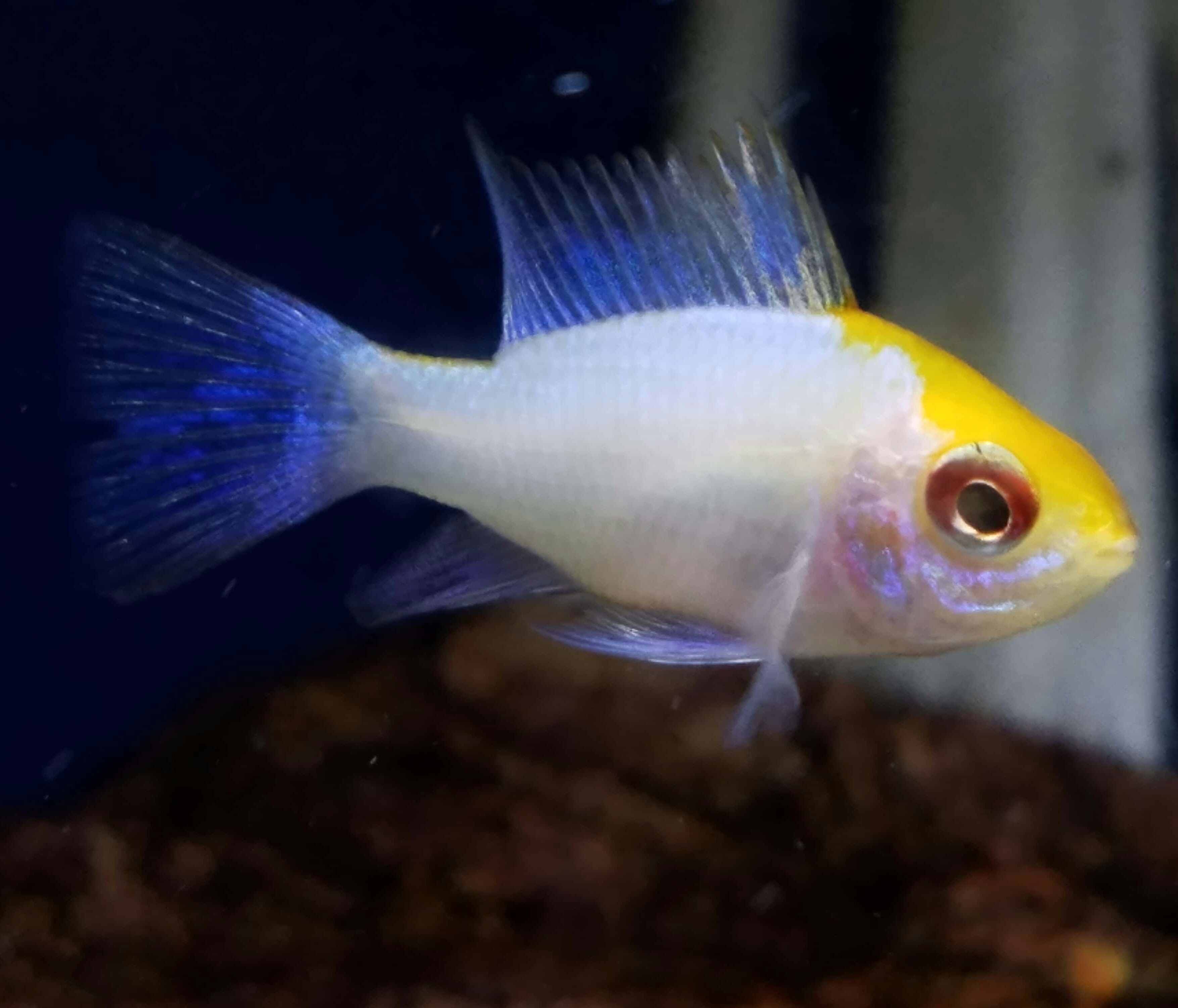 Gold form of the German Blue Ram. A peaceful dwarf cichlid from South America. Prefers water temperatures to be in the low 80’s. Not a picky eater. Great addition to the community aquarium.