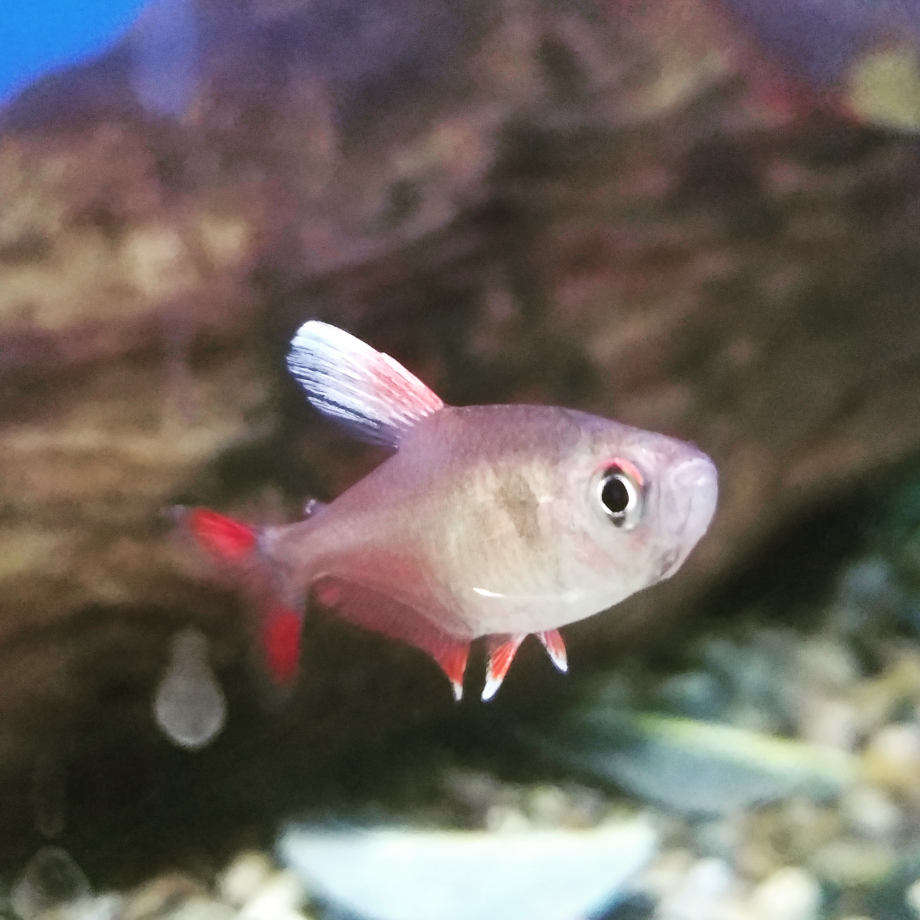 The Whitefin tetra is a yet undescribed species of tetra from South America. Sometimes referred to as the “Candy cane” or ” white fin rosey” tetra whose afult size nears 2 inches. Like most other tetras this is a schooling species. Relatively undemanding in care.